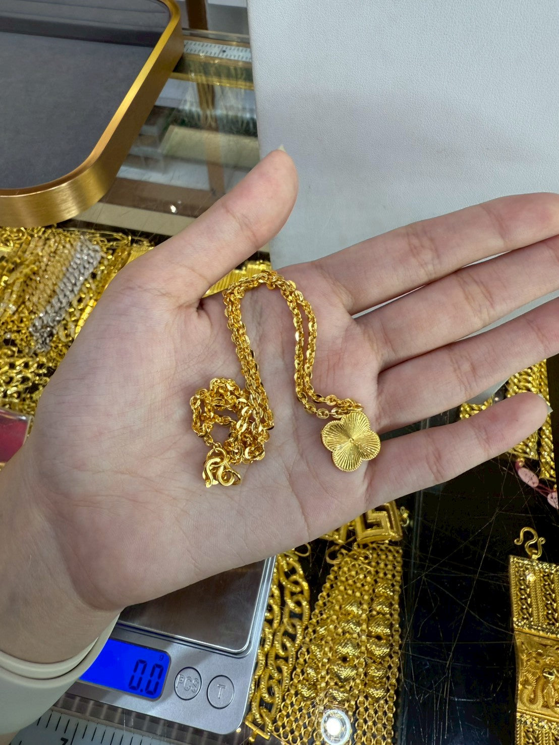 This 23K gold Clover Cable Link necklace (96.5% pure gold) blends refined design with symbolic beauty. The clover motif represents luck, harmony, and positive energy, while the cable link chain adds a strong, modern touch that feels both elegant and confident.