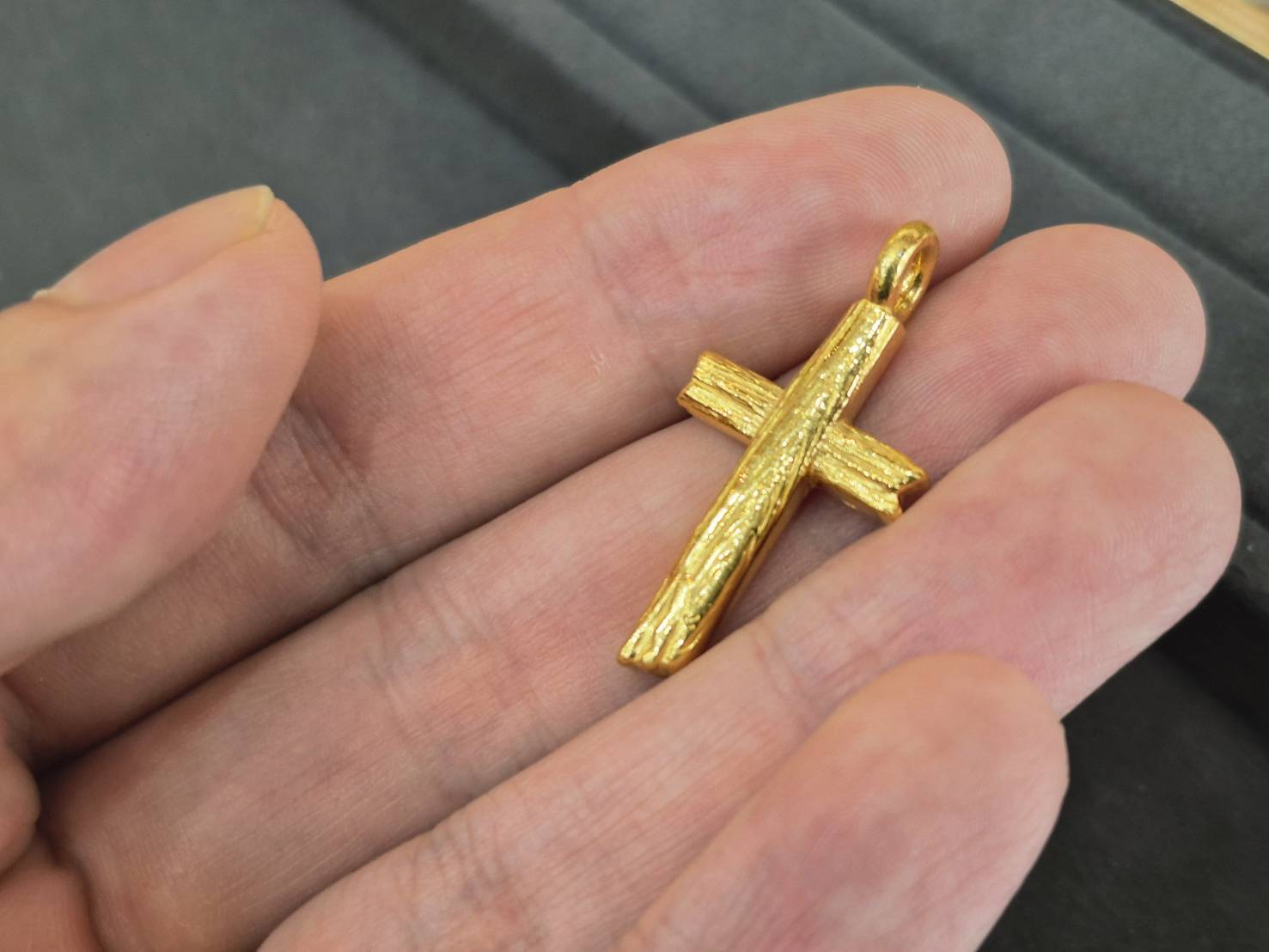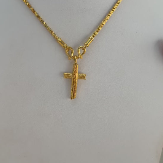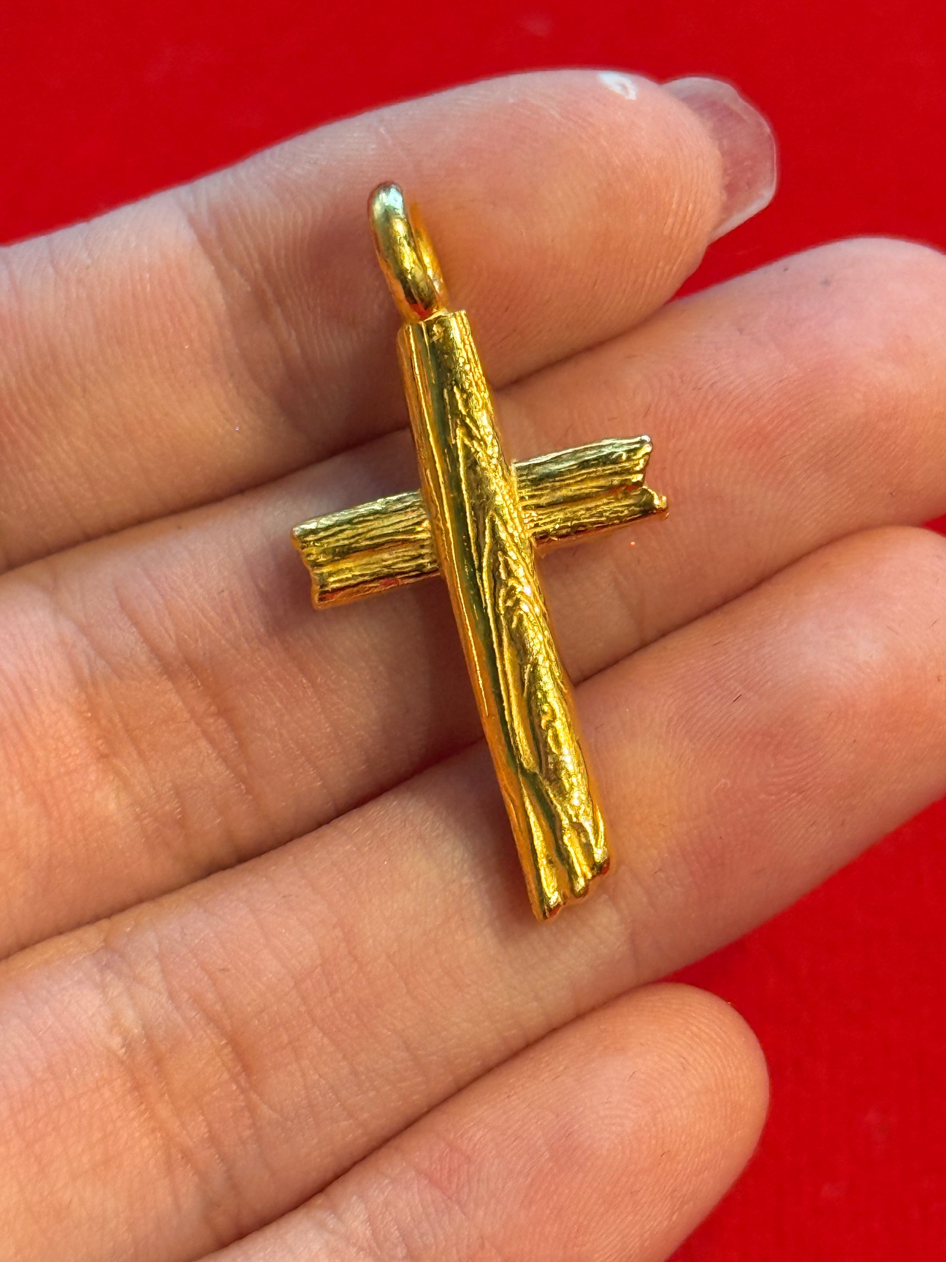 This Bark Cross pendant is crafted from solid 24K gold (99.9% purity), showcasing the rich, deep yellow tone that only pure gold can offer. The textured bark finish adds natural character and dimension, giving the classic cross silhouette a distinctive, elevated look.