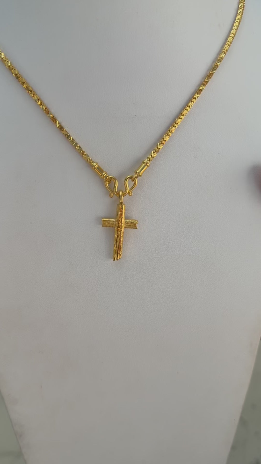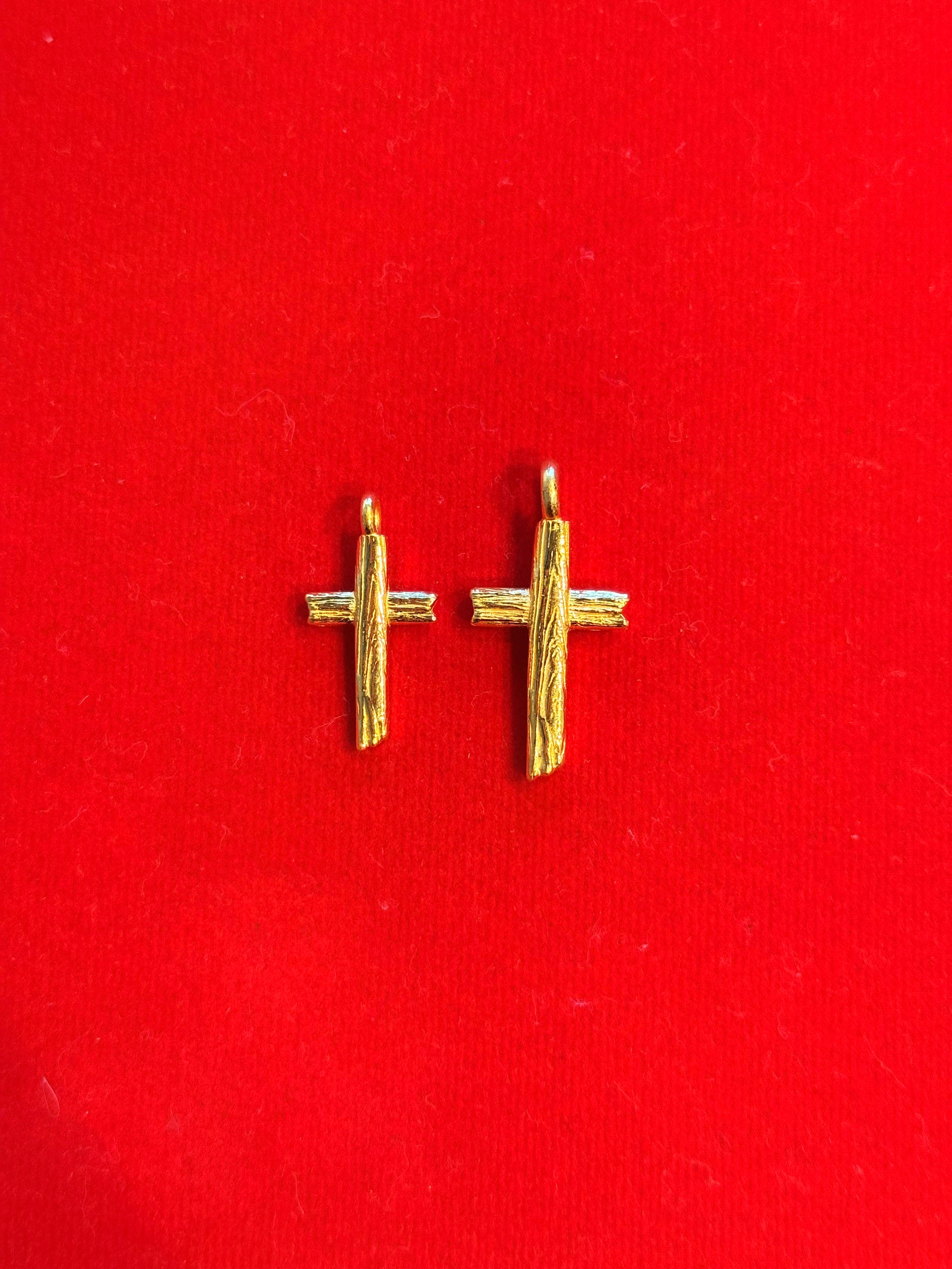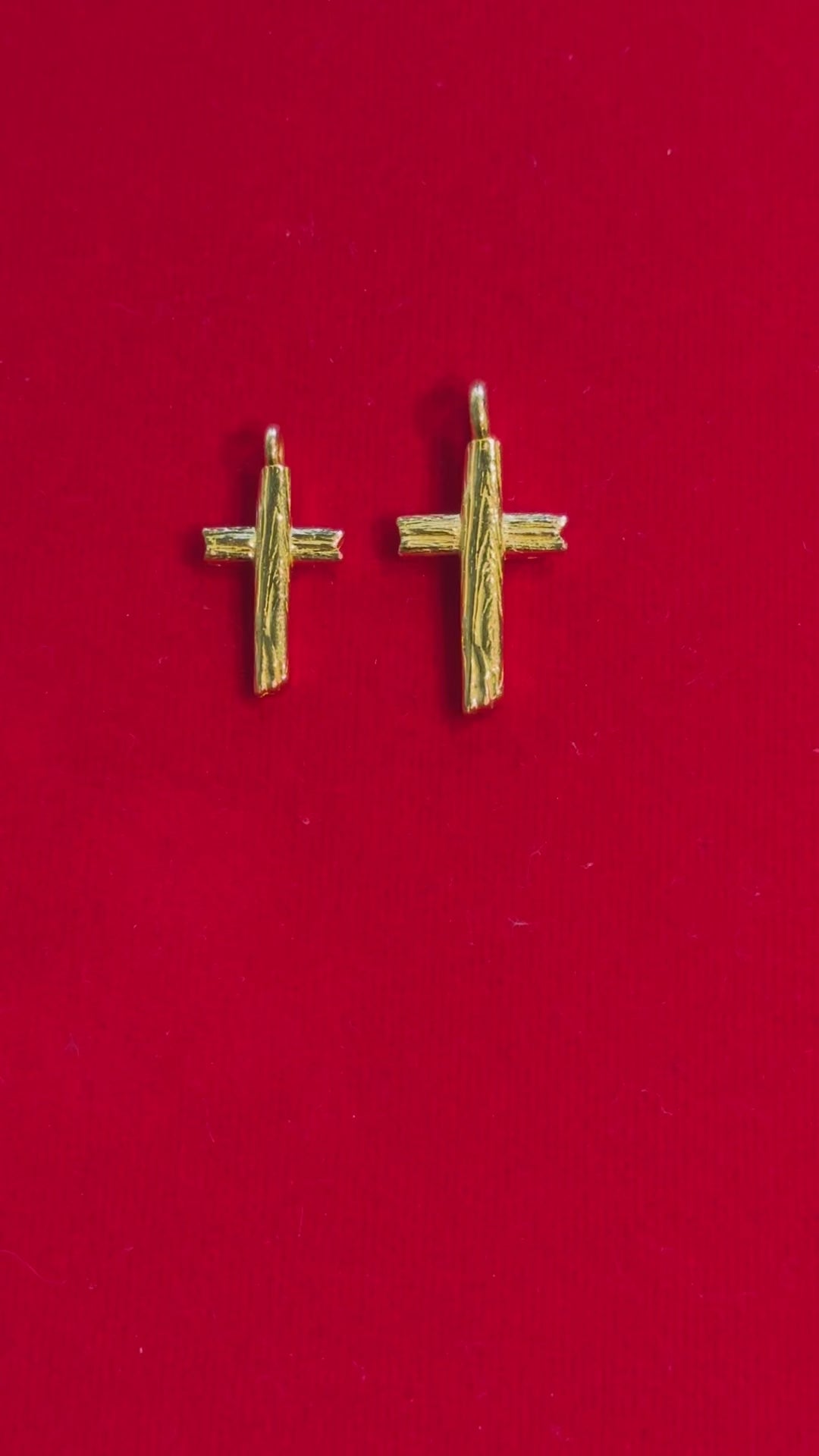 This Bark Cross pendant is crafted from solid 24K gold (99.9% purity), showcasing the rich, deep yellow tone that only pure gold can offer. The textured bark finish adds natural character and dimension, giving the classic cross silhouette a distinctive, elevated look.