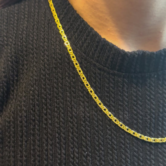 Elegant and timeless, the Horse Eye Chain features elongated oval links that create a smooth, flowing look around the neck. The refined shape reflects light beautifully, giving the chain a bright, natural shine while maintaining a clean and classic style.